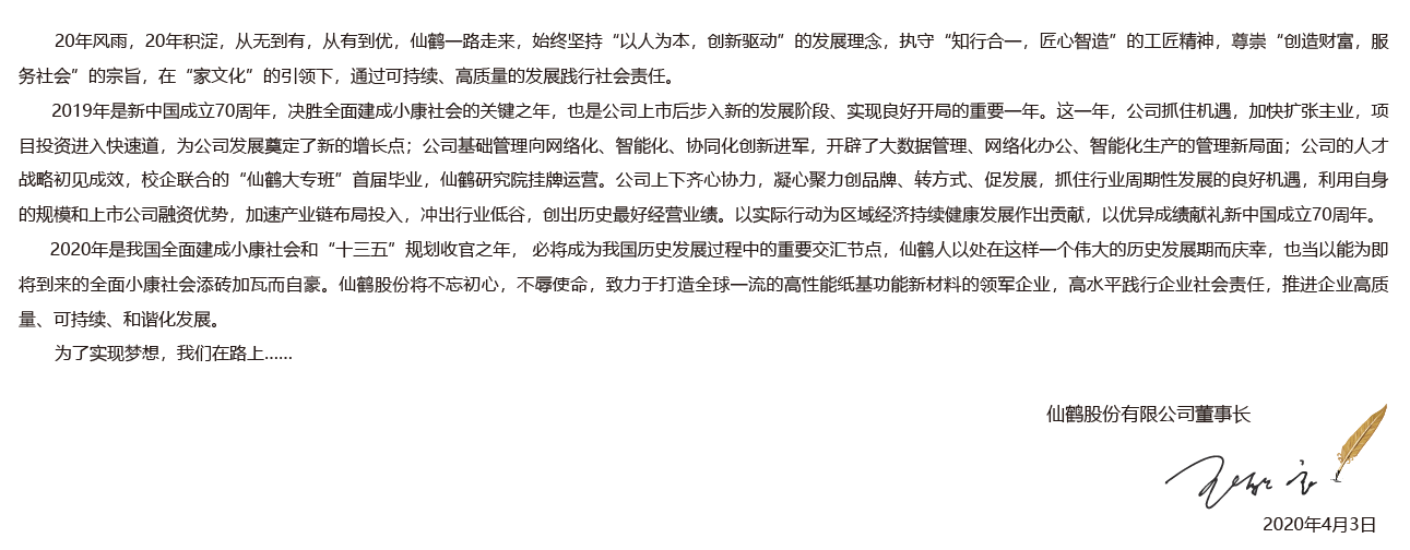 仙鶴股份有限公司將一如既往奉行“創(chuàng)造財(cái)富,服務(wù)社會(huì)”的價(jià)值理念,發(fā)揚(yáng)“誠(chéng)信、高效、創(chuàng)新、圖強(qiáng)”的企業(yè)精神,爭(zhēng)做特種紙行業(yè)的領(lǐng)軍企業(yè),為客戶創(chuàng)造價(jià)值,為員工創(chuàng)造福祉,為股東創(chuàng)造回報(bào),為社會(huì)創(chuàng)造效益。